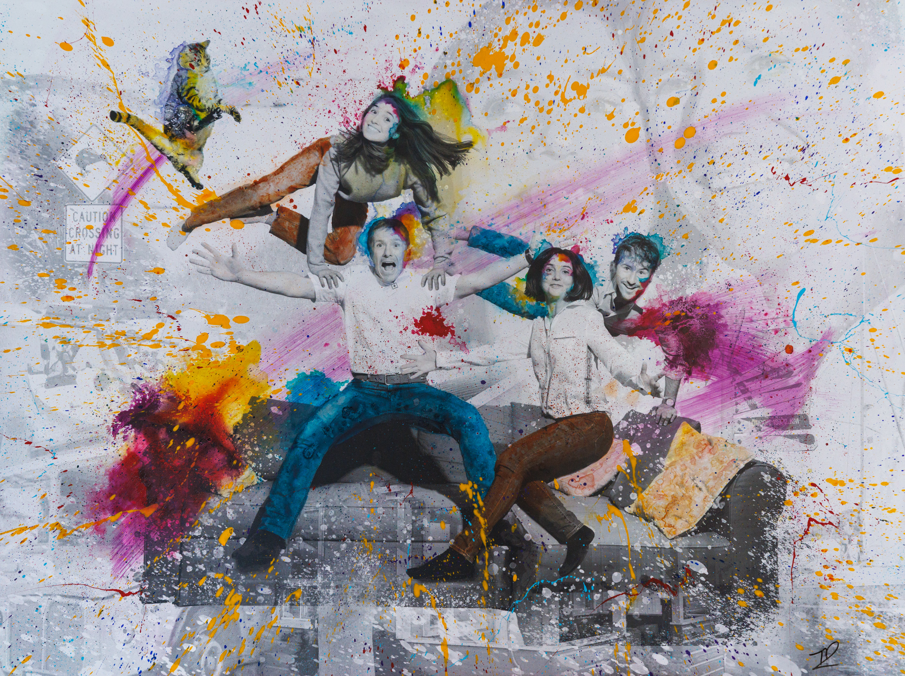 Puis, dans l’intimité de mon atelier, je tisse ces fragments d’existence en une composition vibrante, un montage photographique imprimé sur aluminium ou papier aquarelle, que je sublime ensuite par le geste libre et lumineux de la peinture.